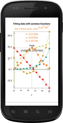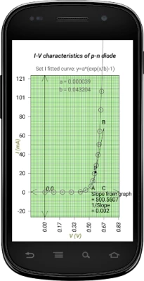 * Once the plotting and fitting is done, double tap on any point on the fitted curve to observe and display the corresponding X-Y point. Perform a slope calculation at that point by drawing a tangent and a right-angled triangle, just as you would do using a conventional graph paper. Also obtain Y value(s) at any X value and X value(s) at any Y value from the fitted curve.