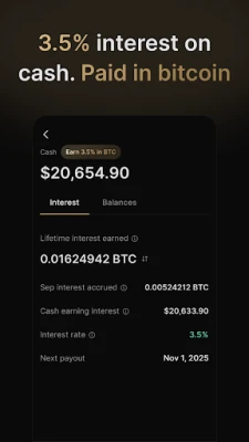Your cash should work for you. Earn interest on cash deposits, with interest that can be paid in Bitcoin. It’s simple, no lock-up period, no monthly fees.